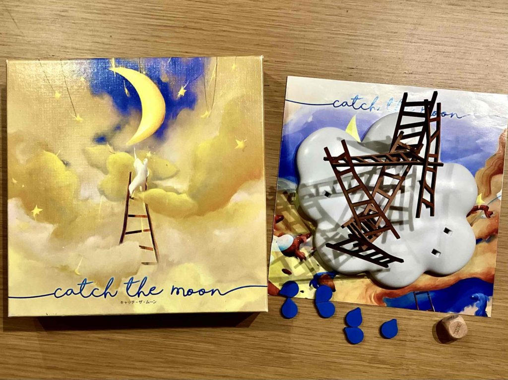 『キャッチ・ザ・ムーン』は、はしごを積み上げて“月”を目指す、見た目にも美しいバランスゲーム🌙✨ プレイヤーはサイコロの出目に従い、1本または2本のはしごを他のはしごに掛けていく。月に近づくように高く積み上げたいけれど、少しのズレで崩れてしまう緊張感がたまらない。倒してしまうと「涙」をもらい、ゲーム終了時に涙が少ない人が勝利。芸術作品のように不安定な構造を作りながら、集中力と手先の感覚を研ぎ澄ませる時間が楽しい。大人も子どもも夢中になれる、幻想的でドラマチックなアクションゲームだ。